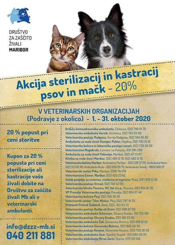 V organizaciji Društva za zaščito živali Maribor bo tudi letos v Podravju in okolici v mesecu oktobru potekala akcija kastracij in sterilizacij mačk. K akciji je pristopilo 26 veterinarskih ambulant, ki bodo med 1. in 31. oktobrom znižale cene obeh posegov za 20 odstotkov. "Skrbniki živali, ki bodo želeli izkoristiti ugodnost, morajo imeti kuponček, ki ga sicer dobijo pri društvu ali v veterinarskih ambulantah," so zapisali na portalu Pes moj prijatelj.