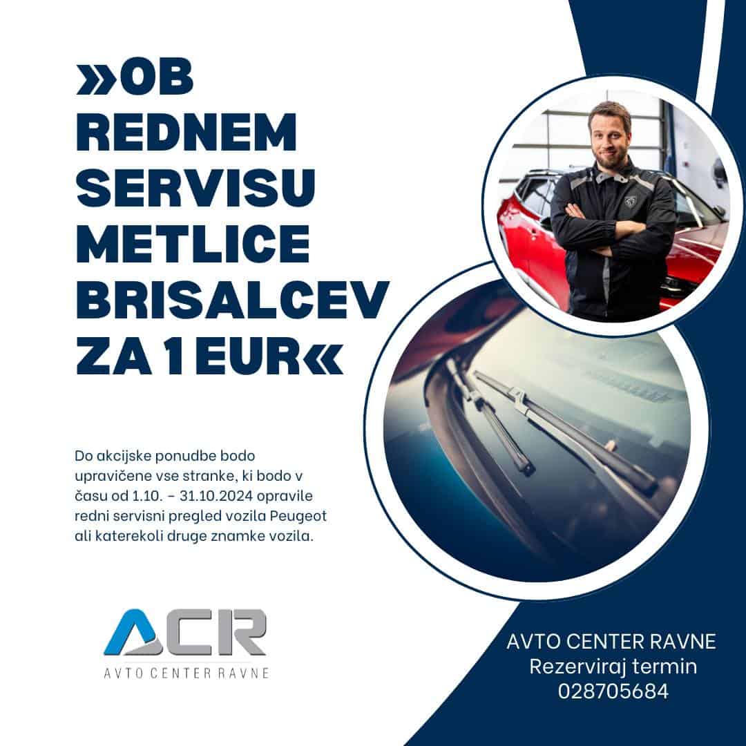 Za vse, ki boste v obdobju od 1. do 31. oktobra 2024 obiskali Avto Center Ravne zaradi rednega servisa vozila, bodo sprednje metlice brisalcev na voljo po neverjetni promocijski ceni - samo 1 €!