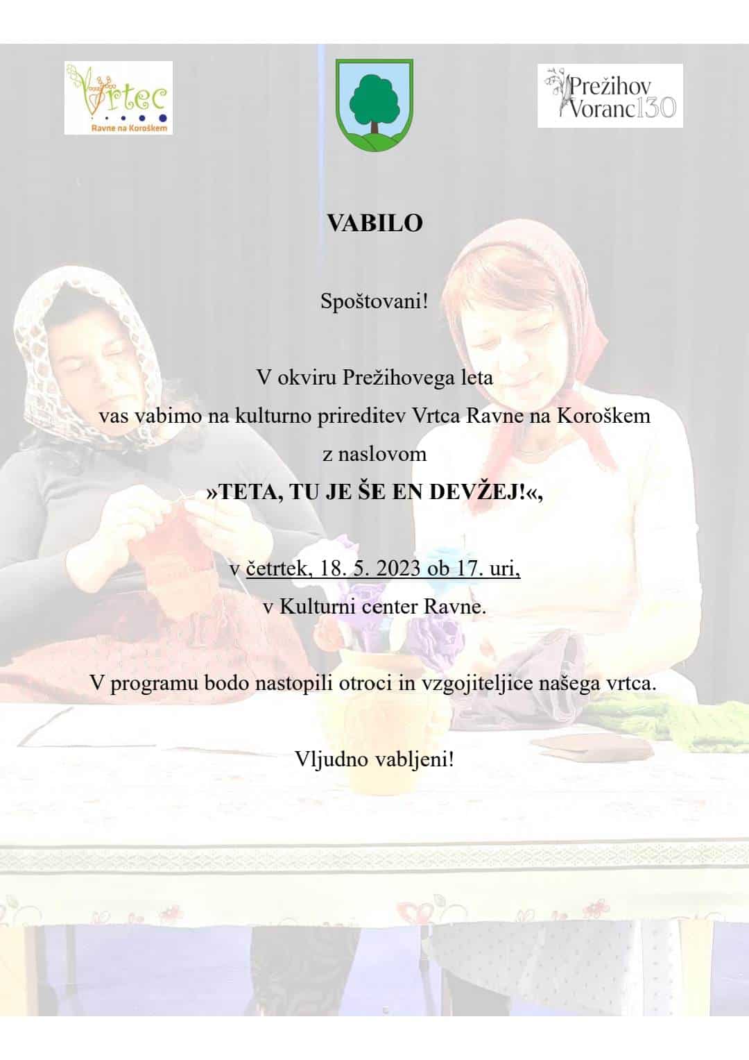 Prireditev bo potekala v četrtek, 18. maja, ob 17. uri v Kulturnem centru na Ravnah na Koroškem. Naslov dogodka se glasi "TETA, TU JE ŠE EN DEVŽEJ!" V programu bodo nastopili otroci in vzgojiteljice vrtca.