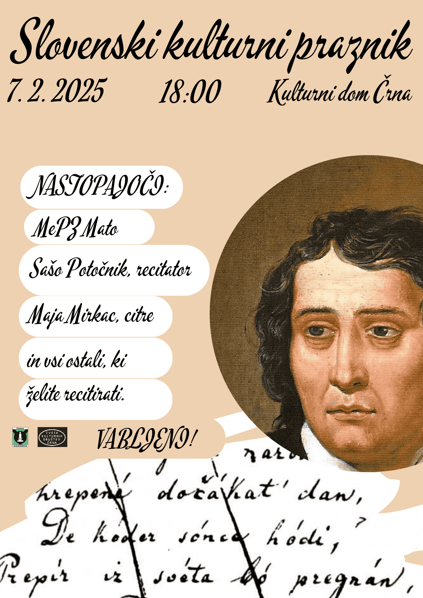 Posebno vabljeni tudi vsi, ki bi želeli recitirati Prešernova ali druga literarna dela ter s tem prispevati k praznovanju slovenske kulture.