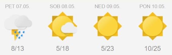 V petek dopoldne in čez dan bo spremenljivo do pretežno oblačno. Najmanj oblačnosti bo v osrednji in jugovzhodni Sloveniji. V zahodni in severni Sloveniji bo občasno deževalo. Čez dan bo od severovzhoda zapihal severovzhodnik. Popoldne se bodo padavine od severa okrepile in postopno, od severa proti jugu, zajele vso državo. Vmes bodo predvsem v osrednji in zahodni Sloveniji nastajale tudi nevihte z močnimi nalivi, lokalno tudi s sodro ali manjšo točo.