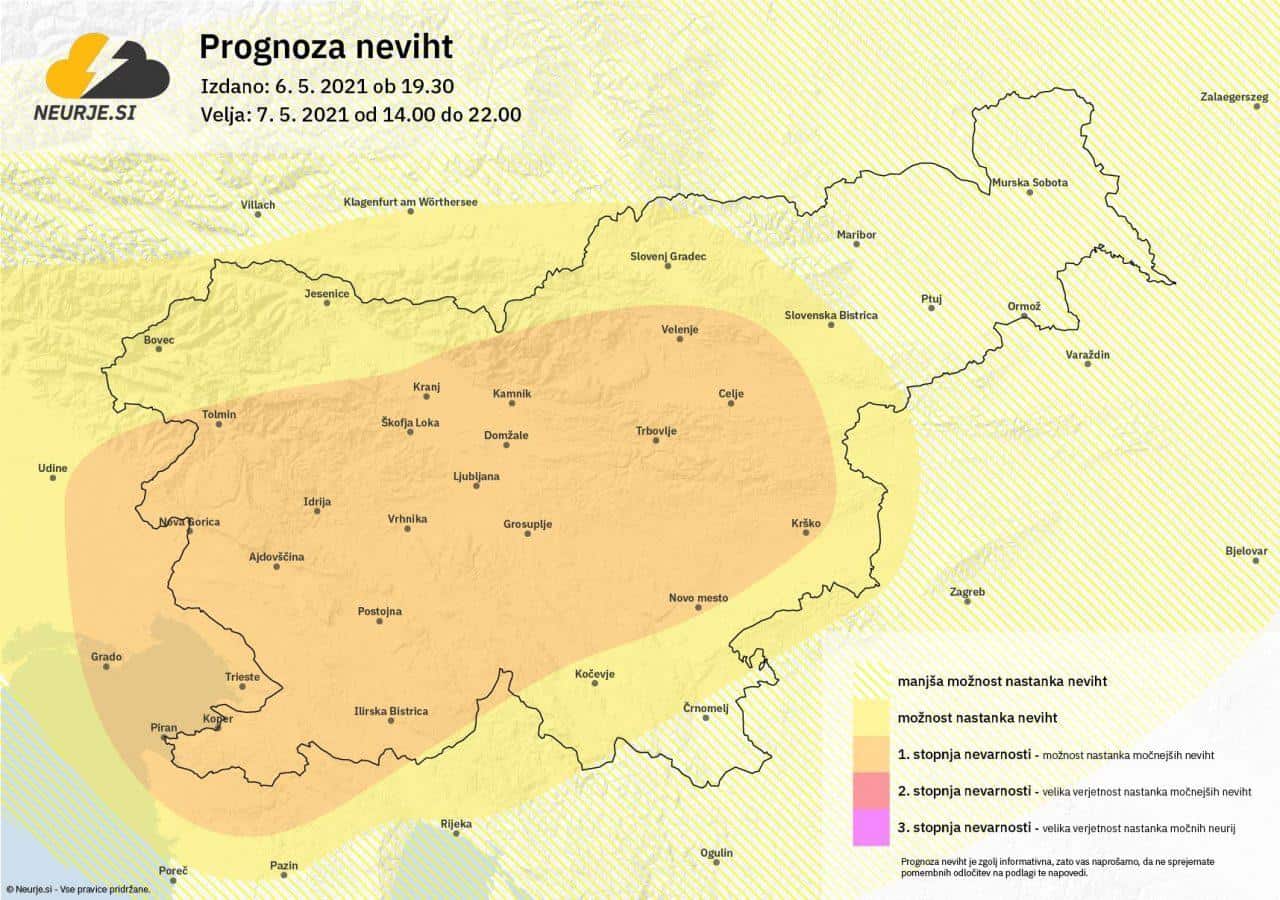 Izrazita hladna fronta bo poskrbela, da bodo na meji med hladnejšim in toplejšim zrakom, ob prihodu vremenske fronte nastajale tudi nevihte. Lokalno bodo možni močni, tudi dolgotrajnejši nalivi in sodra ali manjša toča. Nevihte bodo najbolj verjetne v zahodni in osrednji Sloveniji, kakšna pa se lahko pojavi tudi drugod po državi. Preverite PROGNOZO NEVIHT.