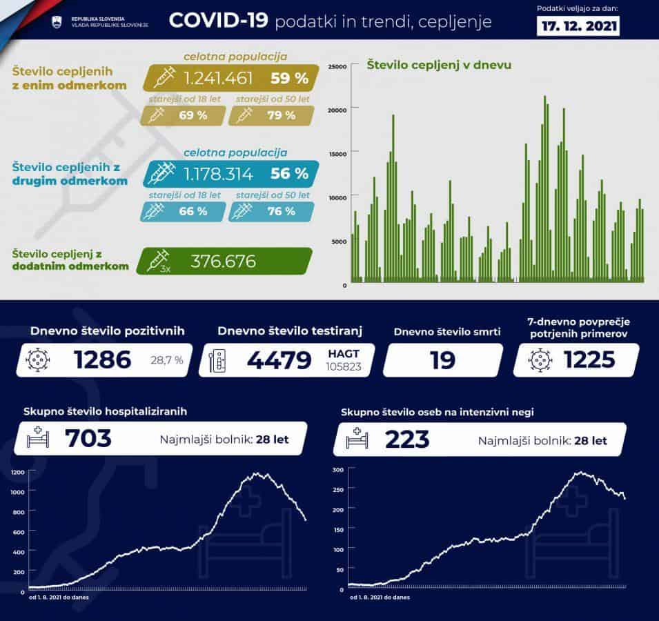 V petek so v Sloveniji ob 4479 PCR-testih potrdili 1286 okužb z novim koronavirusom, dan pred tem so ob 5022 PCR-testih potrdili 1278 okužb. Delež pozitivnih PCR-testov znaša 28,7 odstotka, dan pred tem 25,4 odstotka. Opravili so tudi 105.823 hitrih antigenskih testov, katerih pozitivne rezultate potrjujejo še s PCR-testiranjem, dan pred tem 76.794.