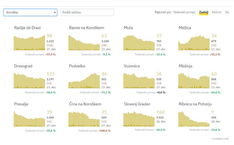 Včeraj so na Koroškem potrdili 29 novih okužb, dan prej 43, pred tednom dni pa 74.V Radljah so jih zabeležili 11, na Ravnah, Muti in Mežici po 3, v Dravogradu, Podvelki in Vuzenici po 2, v Mislinji, na Prevaljah in v Črni pa po 1.