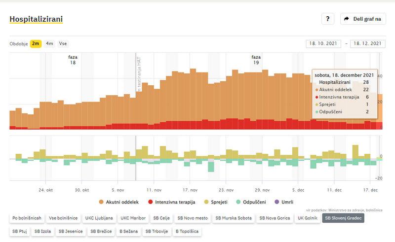 Po podatkih sledilnika v SB Slovenj Gradec zdravijo 28 covidnih bolnikov, dan prej 29. Od teh jih 6 potrebuje intenzivno zdravljenje, enako kot dan prej. V domačo oskrbo so odpustili 2 oseb, na novo so v bolnišnico sprejeli 1 osebo.