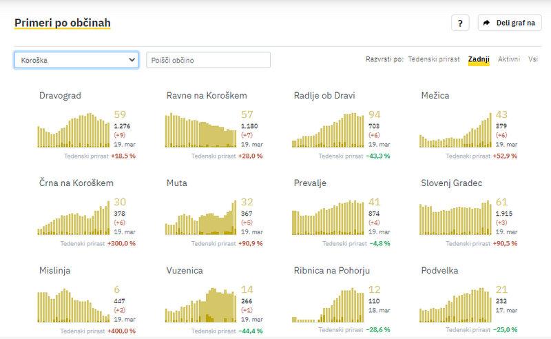 Na Koroškem so v petek največ okužb potrdili v Dravogradu, in sicer 9. Na Ravnah na Koroškem 7, v Radljah ob Dravi, v Mežici in Črni na Koroškem po 6. Na Muti 5, na Prevaljah 4, v Slovenj Gradcu 3, v Mislinji 2, v Vuzenici 1.
