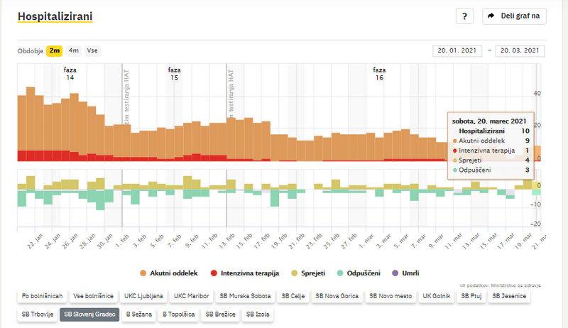 V SB Slovenj Gradec zdravijo 9 covidnih bolnikov, 1 potrebuje intenzivno terapijo. Na novo so na zdravljenje sprejeli 4 bolnike, v domačo oskrbo pa odpustili 3 osebe, kažejo podatki Sledilnika za covid-19.