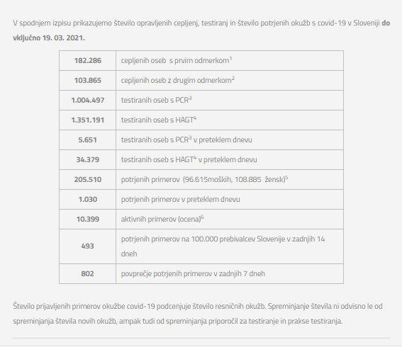 Število opravljenih cepljenj, testiranj in število potrjenih okužb s covid-19 v Sloveniji do vključno 19. 03. 2021.