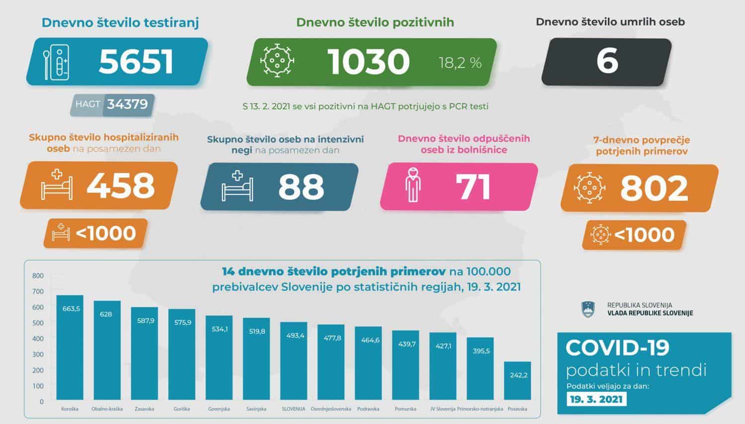 7-dnevno povprečno število okužb je po danes objavljenih podatkih NIJZ višje kot dan pred tem, in sicer znaša 802. Nižje pa je število oseb, ki potrebujejo bolnišnično oskrbo zaradi Covida-19. Sedemdnevno povprečje novopotrjenih okužb je bilo nad 800 nazadnje 16. februarja, ko je znašalo 838.