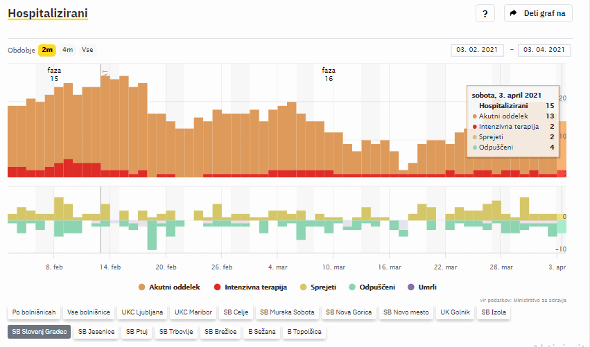 Po zadnjih podatkih Covid-19 sledilnika se v Splošni bolnišnici Slovenj Gradec zdravi 15 covidnih pacientov, dva na oddelku intenzivne terapije. V bolnišnično oskrbo so sprejeli dva bolnika, štiri pa so odpustili v domačo oskrbo.