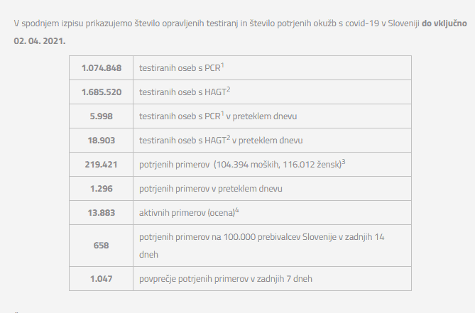 Število opravljenih testiranj in število potrjenih okužb do vključno 2. 4. 2021:
