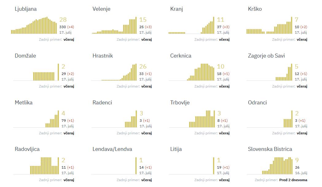 Največ pozitivnih testov so včeraj potrdili v Ljubljani, in sicer štiri, sledijo Velenje in Kranj s tremi okužbami ter Krško in Domžale z dvema. Po eno okužbo so zabeležili še v občinah Hrastnik, Litija, Zagorje ob Savi, Trbovlje, Radovljica, Cerknica, Metlika, Radenci, Ordanci in Lendava.