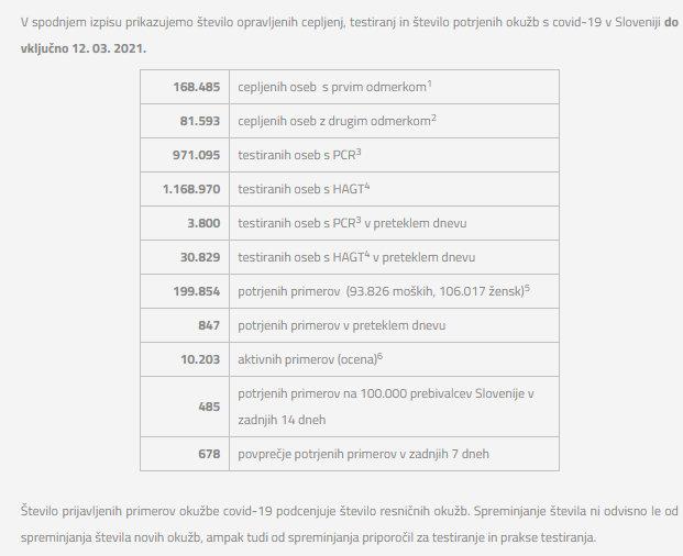 Trend obolelosti s koronavirusom v Sloveniji na dan 12. 3. 2021 (00:00-24:00):