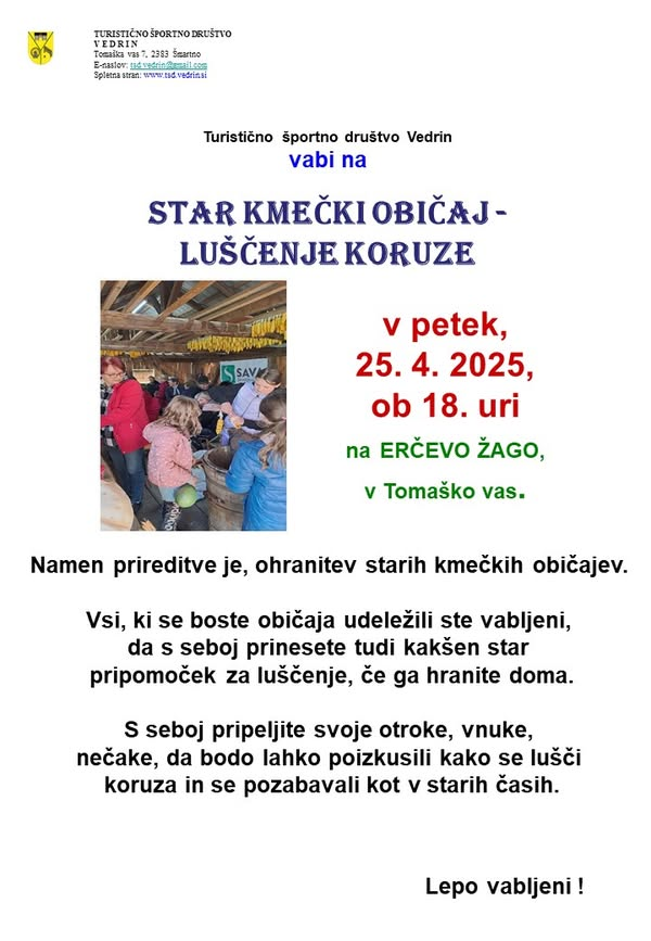 Vse obiskovalce tokratnega dogodka vabijo, da s seboj prinesejo stare pripomočke za luščenje koruze, s čimer bo dogodek še bolj avtentičen in pester. Dogodek bo priložnost za druženje vseh generacij, pa tudi za spomin na čase, ko so ljudje znali najti veselje v skupnem delu in preprostosti.