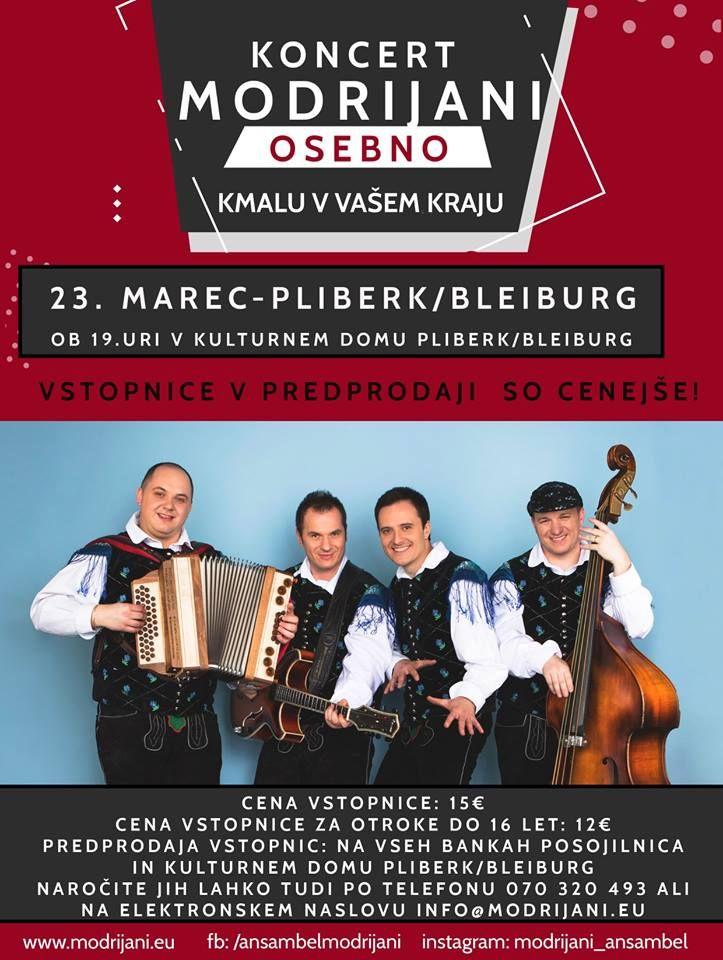 Tokrat pa vas Modrijani vabijo na koncert v Kulturni dom Pliberk, kjer vas bodo razvajali in zabavali 23. 3. 2019 od 19.00 naprej.