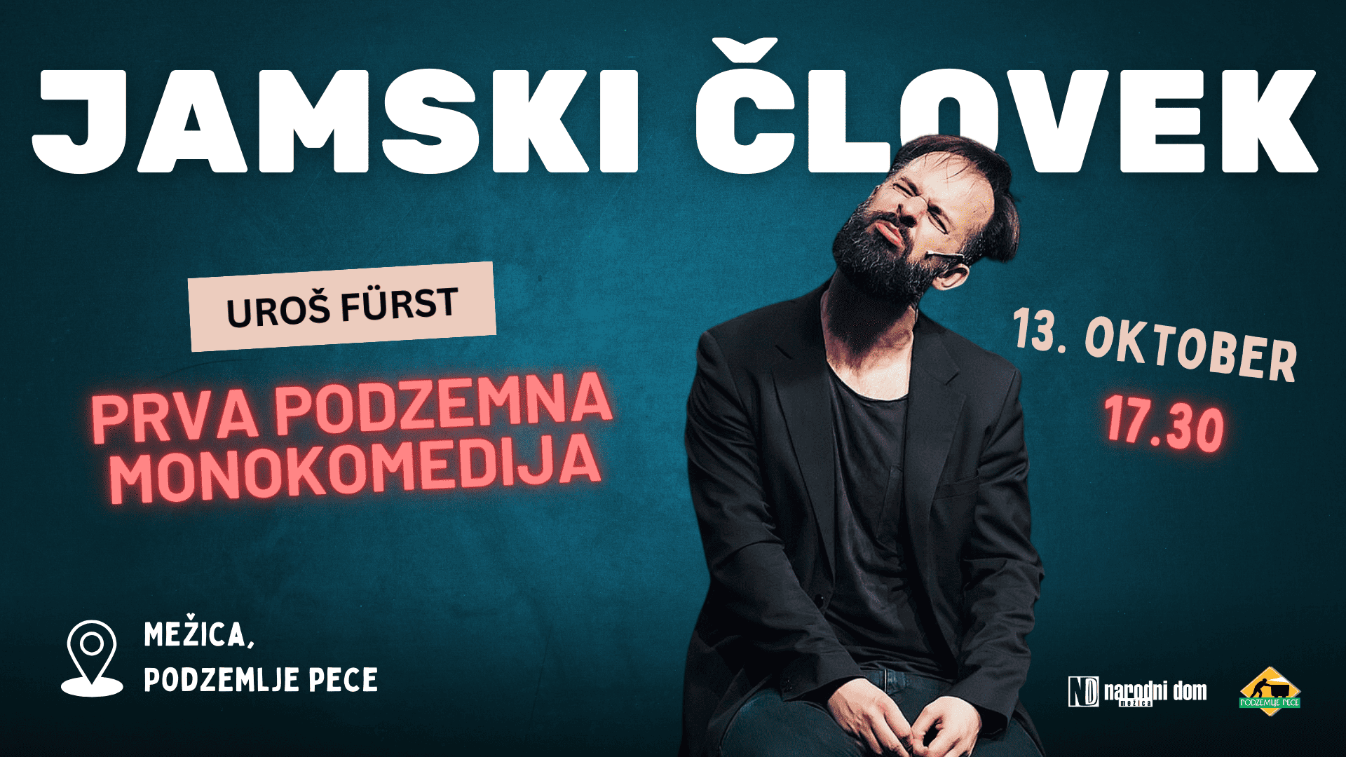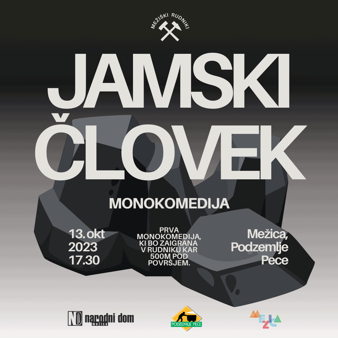 V petek, 13. oktobra 2023 bo v Mežici premierno izvedena uspešna monokomedija Uroša Fursta JAMSKI ČLOVEK v pravi jami – v Podzemlju Pece, bivšem Rudniku svinca in cinka Mežica. Čaka vas torej vrhunska predstava – v edinstvenem in neponovljivem ambientu.