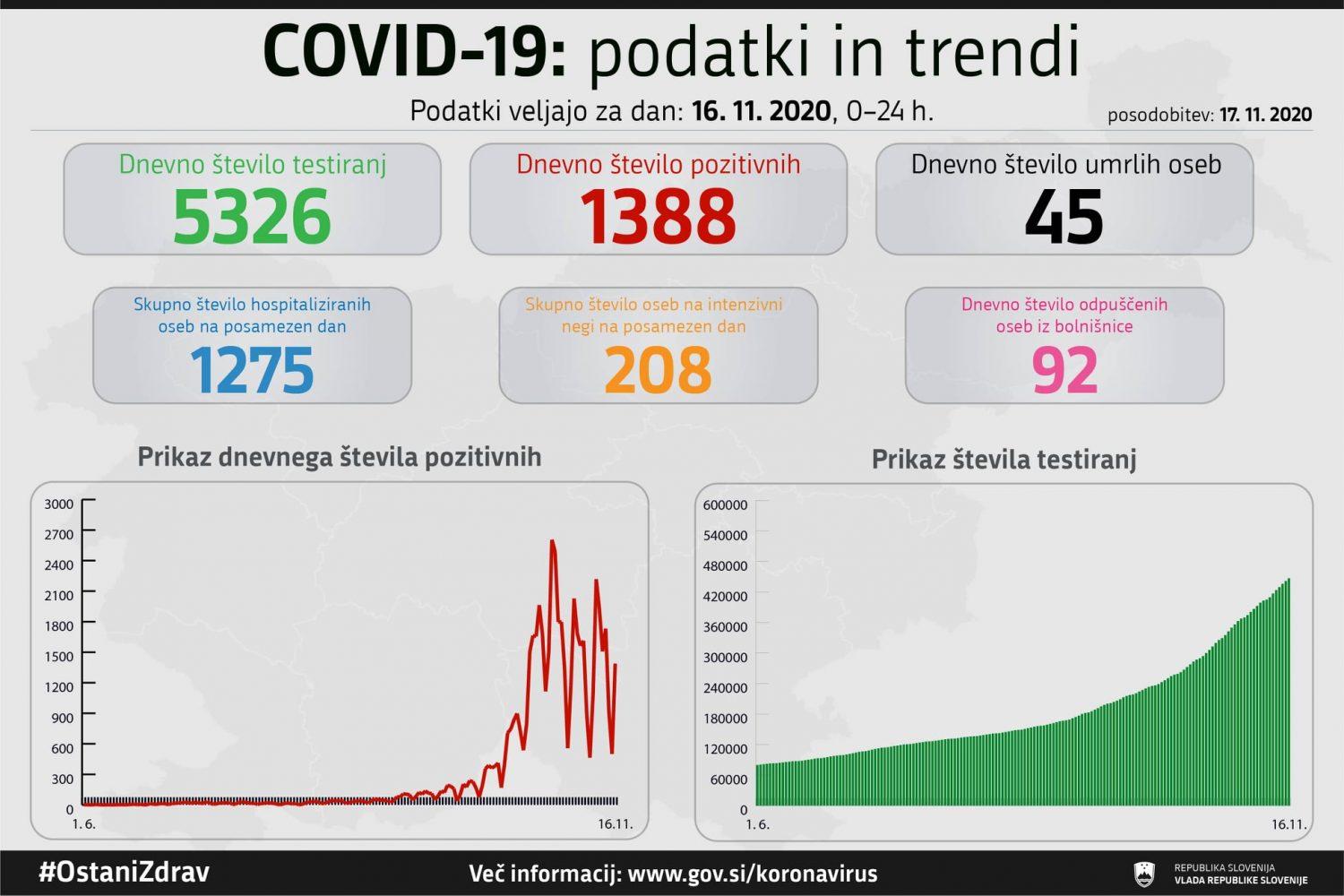 Trend obolelosti s koronavirusom v Sloveniji na dan 16. 11. 2020 (00:00-24:00):