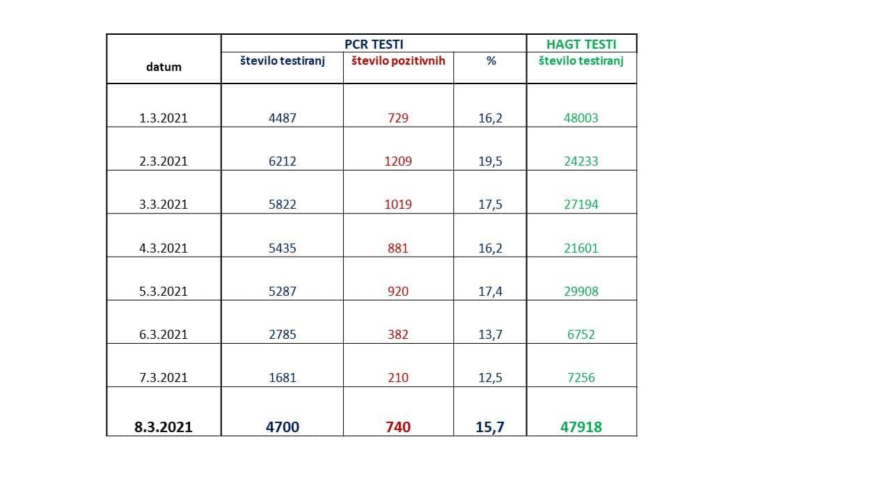 Včeraj je bilo opravljenih 4.700 PCR testiranj in 47.918 hitrih antigenskih testov. S PCR testi je bilo včeraj potrjenih 740 novih okužb, je razložila Maja Bratuša.