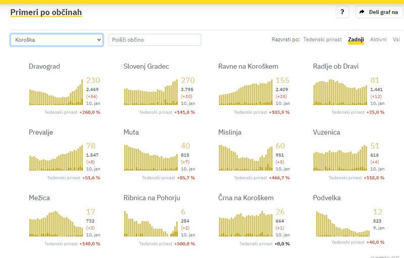 Na Koroškem so včeraj potrdili 153 novih okužb. V Dravogradu so jih zabeležili 56, v Slovenj Gradcu 30, na Ravnah na Koroškem 25, v Radljah ob Dravi 12, na Prevaljah 8, na Muti 7, v Mislinji 5, v Vuzenici 4, v Mežici 3, v Ribnici na Pohorju 2, v Črni na Koroškem 1.