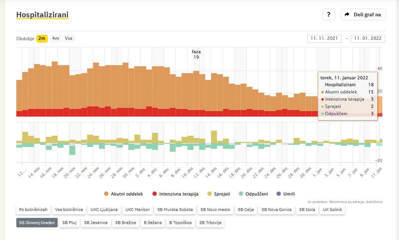 Po zadnjih podatkih vlade v bolnišnicah zdravijo 553 covidnih bolnikov, dan prej 572. od tega 160 na intenzivni negi, dan prej 157. V ponedeljek so umrli trije covidni bolniki. Po podatkih sledilnika v SB Slovenj Gradec zdravijo 18 covidnih bolnikov. Od teh 3 potrebujejo intenzivno zdravljenje. Na novo so v bolnišnico sprejeli 2 osebi, v domačo oskrbo pa so odpustili 3.