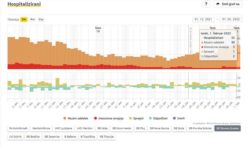 Kot je na Twitterju objavilo ministrstvo, je skupno število hospitaliziranih s potrjeno okužbo 887. Od teh jih je na navadnih oddelkih 391 zaradi covida-19 in 364 s covidom-19, intenzivno terapijo pa zaradi covida-19 potrebuje 116 bolnikov. Poleg teh je na intenzivnem oddelku še 16 bolnikov s covidom-19.