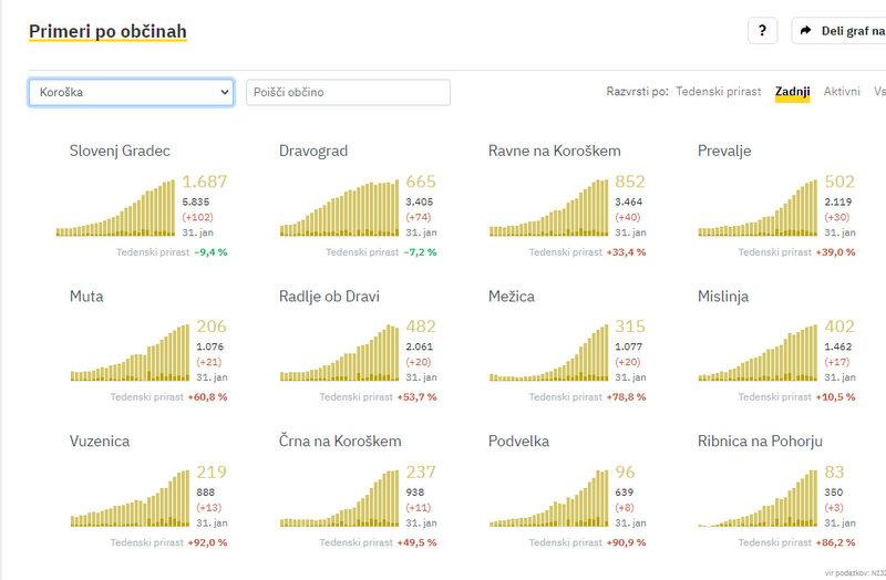 Na Koroškem so včeraj potrdili novih okužb 359, pred tednom dni 536. V Slovenj Gradcu 102, v Dravogradu 74, na Ravnah na Koroškem 40, na Prevaljah 30, na Muti 21, v Radljah ob Dravi in Mežici po 20. v Mislinji 17, v Vuzenici 13, v Črni na Koroškem 11, v Podvelki 8, v Ribnici na Pohorju 3.