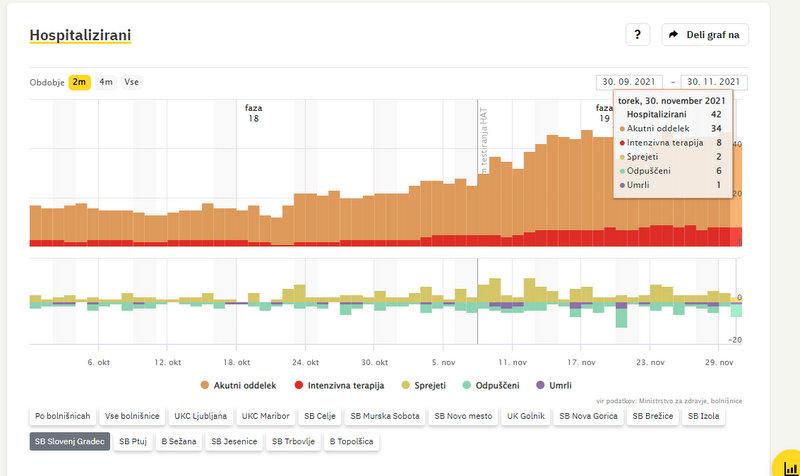 V SB Slovenj Gradec zdravijo 42 covidnih bolnikov, 5 manj kot dan prej. Intenzivno terapijo jih potrebuje 8. V bolnišnico so na novo sprejeli 2 osebi, v domačo oskrbo so odpustili 6 oseb, umrla je 1 oseba.