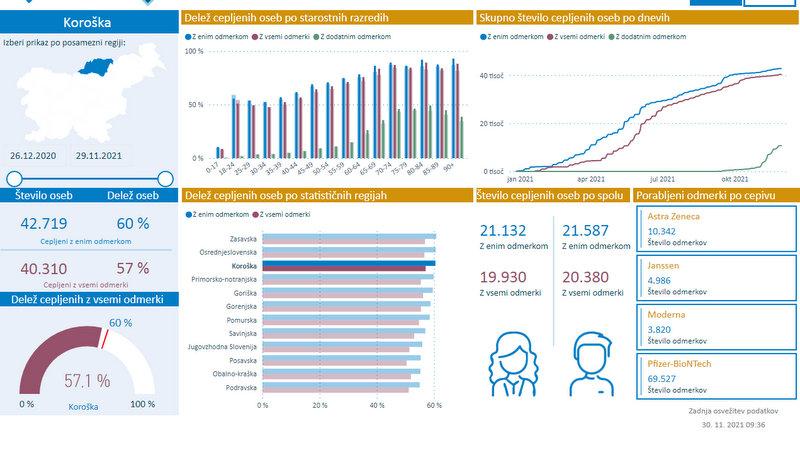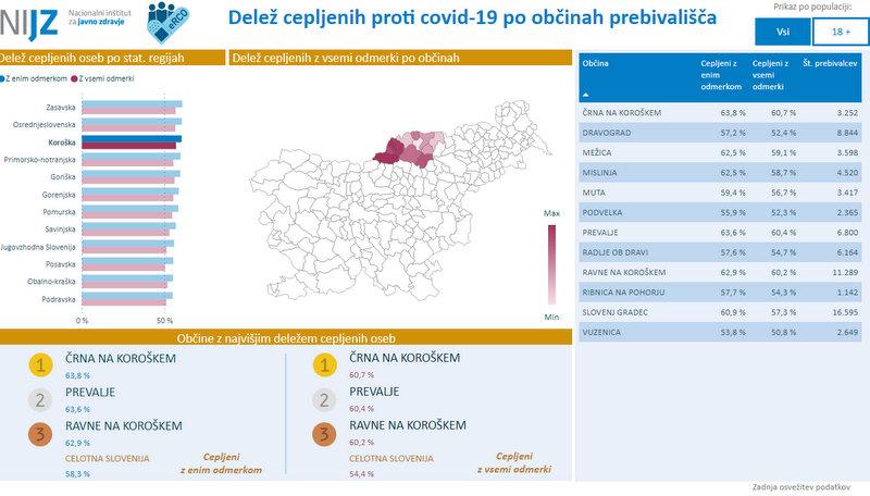 Na Koroškem je z enim odmerkom cepiva proti covidu-19 po podatkih NIJZ cepljenih 42.719 ljudi, z vsemi potrebnimi odmerki pa 40.310 oseb. V regiji po precepljenosti izstopa Črna na Koroškem, sledijo pa Prevalje in Ravne na Koroškem. Najslabšo precepljenost beležijo v Vuzenici.