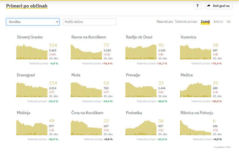V ponedeljek so na Koroškem potrdili 71 novih okužb, dan prej 34, pred tednom ni pa 84. V Slovenj Gradcu so jih zabeležili 14, na Ravnah na Koroškem 11, v Radljah ob Dravi in v Vuzenici po 8, v Dravogradu in na Muti po 7, na Prevaljah 6, v Mežici 4, v Mislinji in Črni na Koroškem po 2, v Podvelki in Ribnici na Pohorju pa po 1.