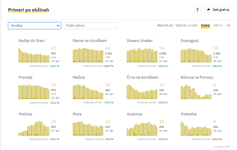 Na Koroškem so v ponedeljek največ novih okužb potrdili v Radljah ob Dravi, in sicer 4, na Ravnah na Koroškem 3, v Slovenj Gradcu, Dravogradu in na Prevaljah pa po 1.