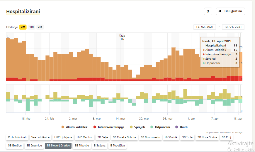 Po zadnjih podatkih Covid-19 sledilnika se v Splošni bolnišnici Slovenj Gradec zdravi 18 covidnih pacientov, 3 na oddelku intenzivne terapije. Na novo so sprejeli dva bolnika s potrjeno okužbo, v domačo oskrbo pa odpustili tri. Umrl ni nihče.