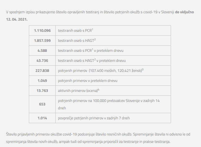 Število opravljenih testiranj in število potrjenih okužb s covid-19 v Sloveniji do vključno 12. 04. 2021.
