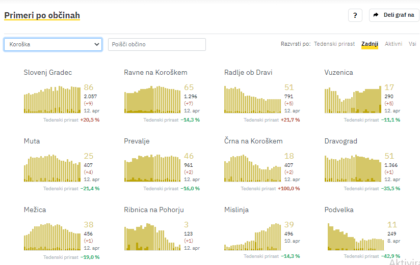 Slovenj Gradec 9, Ravne na Koroškem 7, Radlje ob Dravi 5, Vuzenica 5, Muta 4, Prevalje 2, Črna na Koroškem 2, Dravograd 1, Mežica 1, Ribnica na Pohorju 1.