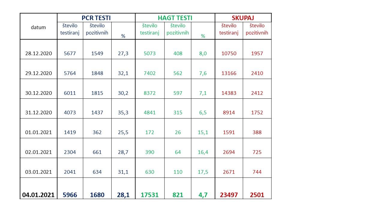 Vladni govorec Jelko Kacin je dejal, da je bilo včeraj opravljenih 5.966 PCR testov, z njimi je bilo potrjenih 1.680 novih okužb, delež pozitivnih PCR testov je znašal 28,16 %. Hkrati je bilo opravljenih tudi 17.531 hitrih antigenskih testov, z katerimi je bilo potrjenih 821 novih okužb (4,7 %).