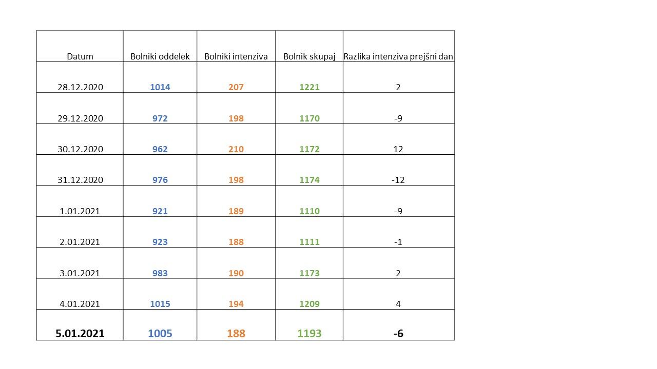 Včeraj je bilo v bolnišnice na novo sprejetih 112 pacientov, odpuščenih je bilo 108 oseb. Skupno število pacientov s potrjeno okužbo, ki so včeraj potrebovali bolnišnično oskrbo je znašalo 1193, 16 manj kot dan prej. Na intenzivni negi se je včeraj zdravilo 188 oseb, 6 manj kot dan prej, je še dejal Kacin.
