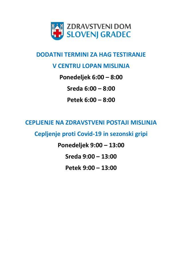 Iz ZD Slovenj Gradec so sporočili nov urnik za testiranje v Centru Lopan Mislinja in za cepljenje v ZD Mislinja. Urnik začne veljati v sredo, 10. 11. 2021.