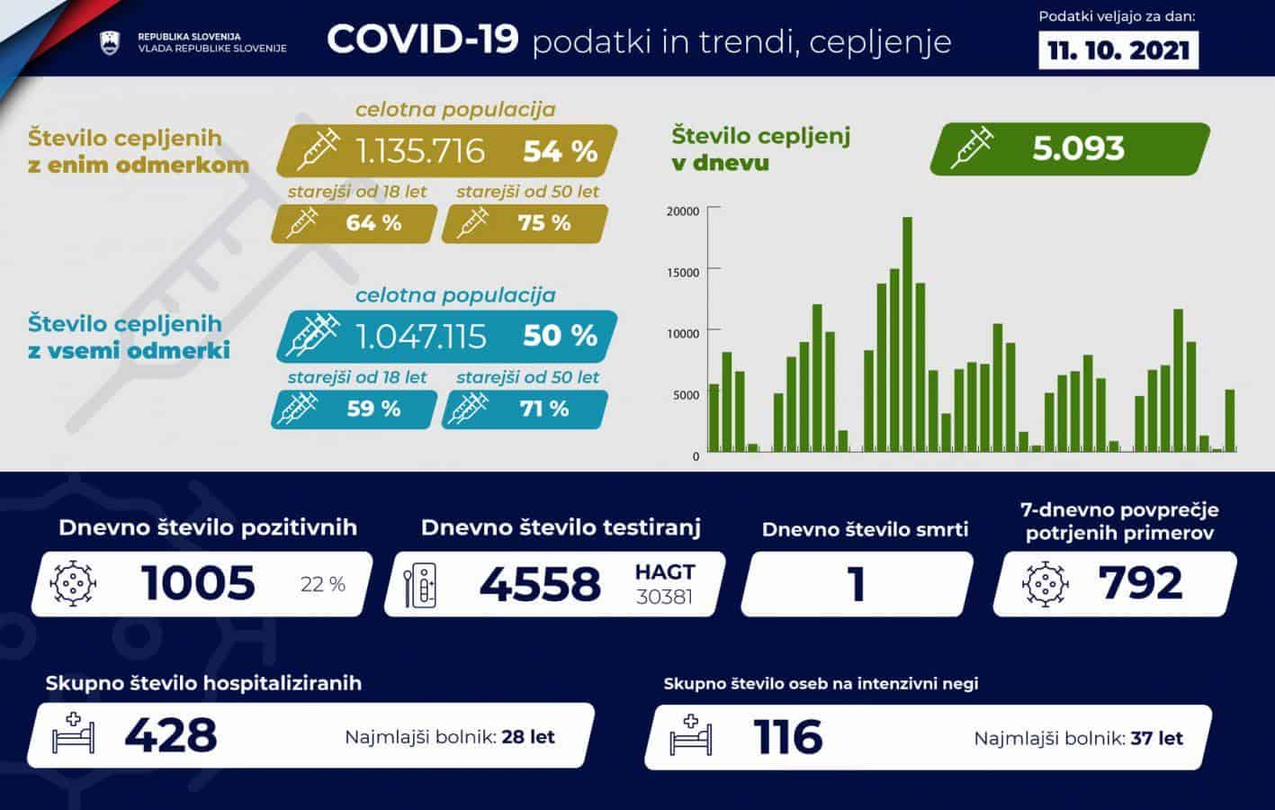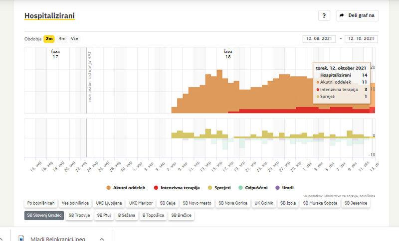 V bolnišnicah po podatkih vlade zdravijo 428 covidnih bolnikov, 6 več kot dan pred tem. 116 jih potrebuje intenzivno zdravljenje, 5 manj kot dan pred tem. V ponedeljek je umrl en covidni bolnik. V Splošni bolnišnici Slovenj Gradec zdravijo 14 covidnih bolnikov, kažejo podatki sledilnika. Od teh trije potrebujejo intenzivno terapijo.