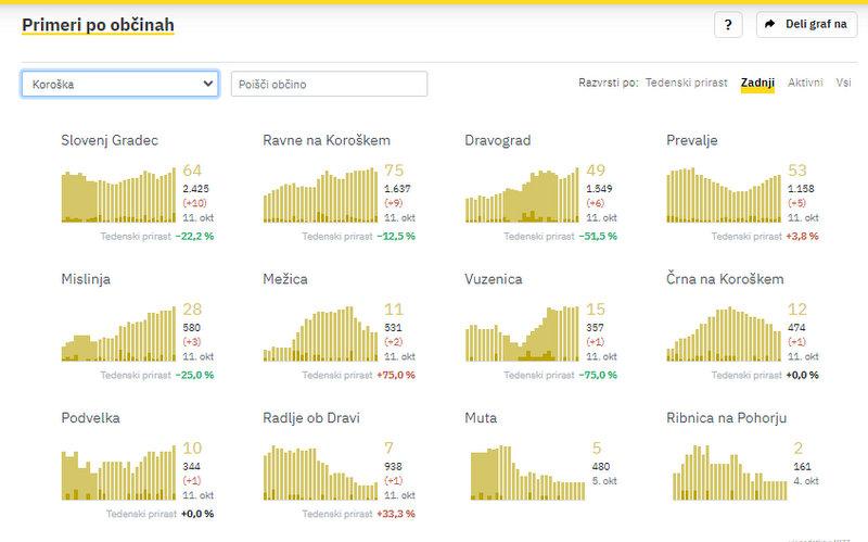 Na Koroškem so po podatkih sledilnika potrdili 39 novih okužb, in sicer največ v Slovenj Gradcu, kjer so jih zabeležili 10. Na Ravnah na Koroškem 9, v Dravogradu 6, na Prevaljah 5, v Mislinji 3, v Mežici 2, v Vuzenici, Črni na Koroškem, Podvelki in Radljah ob Dravi pa po 1.