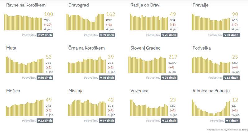 Na Koroškem so nove okužbe potrdili v vseh občinah, največ so jih zabeležili na Ravnah na Koroškem, in sicer 10. Po 8 novih okužb so potrdili v Dravogradu in Radljah ob Dravi, na Prevaljah 7, na Muti in v Črni na Koroškem po 5. v Slovenj Gradcu in Podvelki po 4, v Mežici 3, v Mislinji in Vuzenici po 2, v Ribnici na Pohorju pa 1.