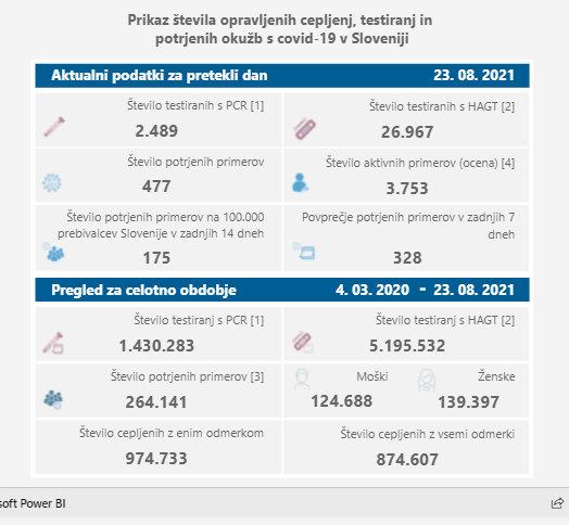 Trenutno je v državi po ocenah NIJZ aktivnih primerov okužb 3.495 (dan pred tem 3.423). Sedemdnevno povprečje števila potrjenih okužb pa znaša 328 (dan prej 304). Medtem je 14-dnevno povprečje števila okužb na 100.000 prebivalcev znašalo 175, dan pred tem 163.