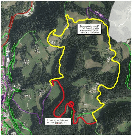 Na priloženi grafiki je z rdečo barvo označen odsek ceste, kjer bo zapora veljala, z rumeno barvo pa je prikazan obvoz. Obvoz bo možen po delu javne poti JP 757761 Gutovnik – Jež ter po odseku lokalne ceste LC 350273.