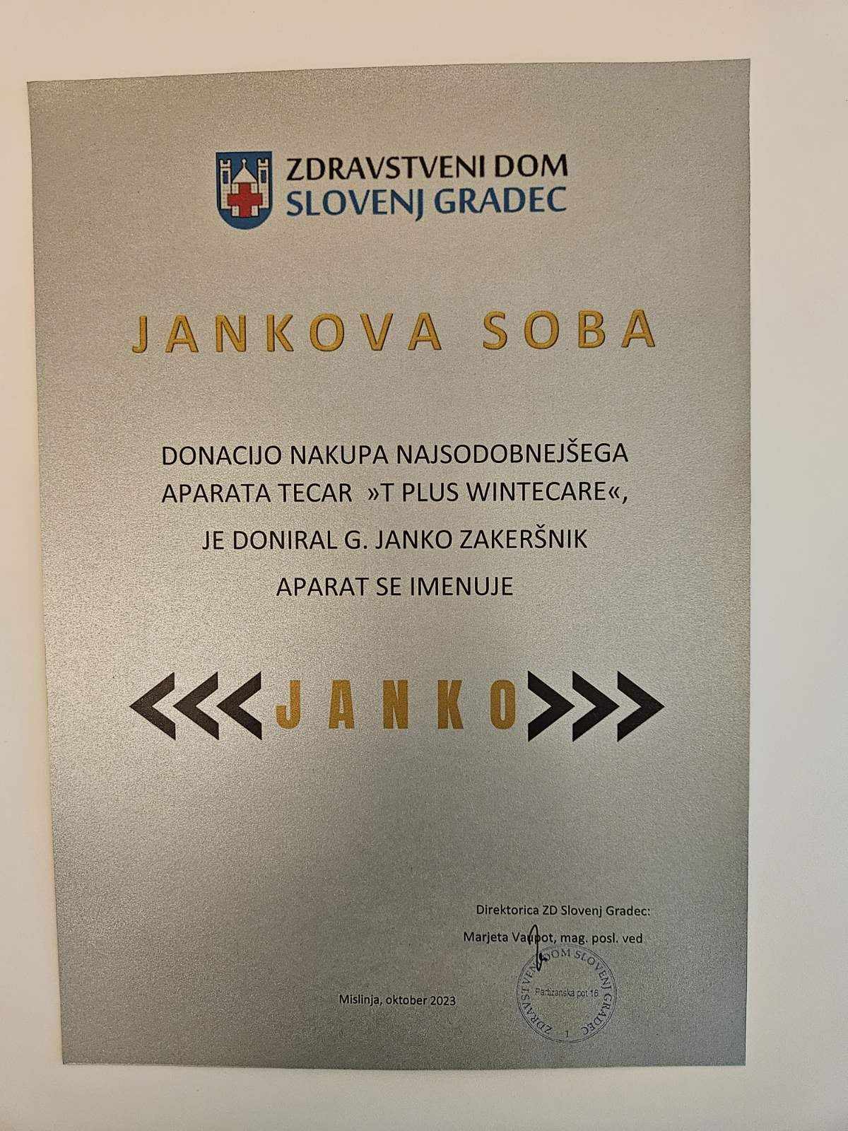 Ob tem so sobo v novih prostorih fizioterapije v Mislinji, kjer bo novi aparat stal, poimenovali Jankova soba. Aparat sam pa je tudi dobil ime Janko, po dobrotniku, ki je omogočil nakup najnovejše pridobitve.