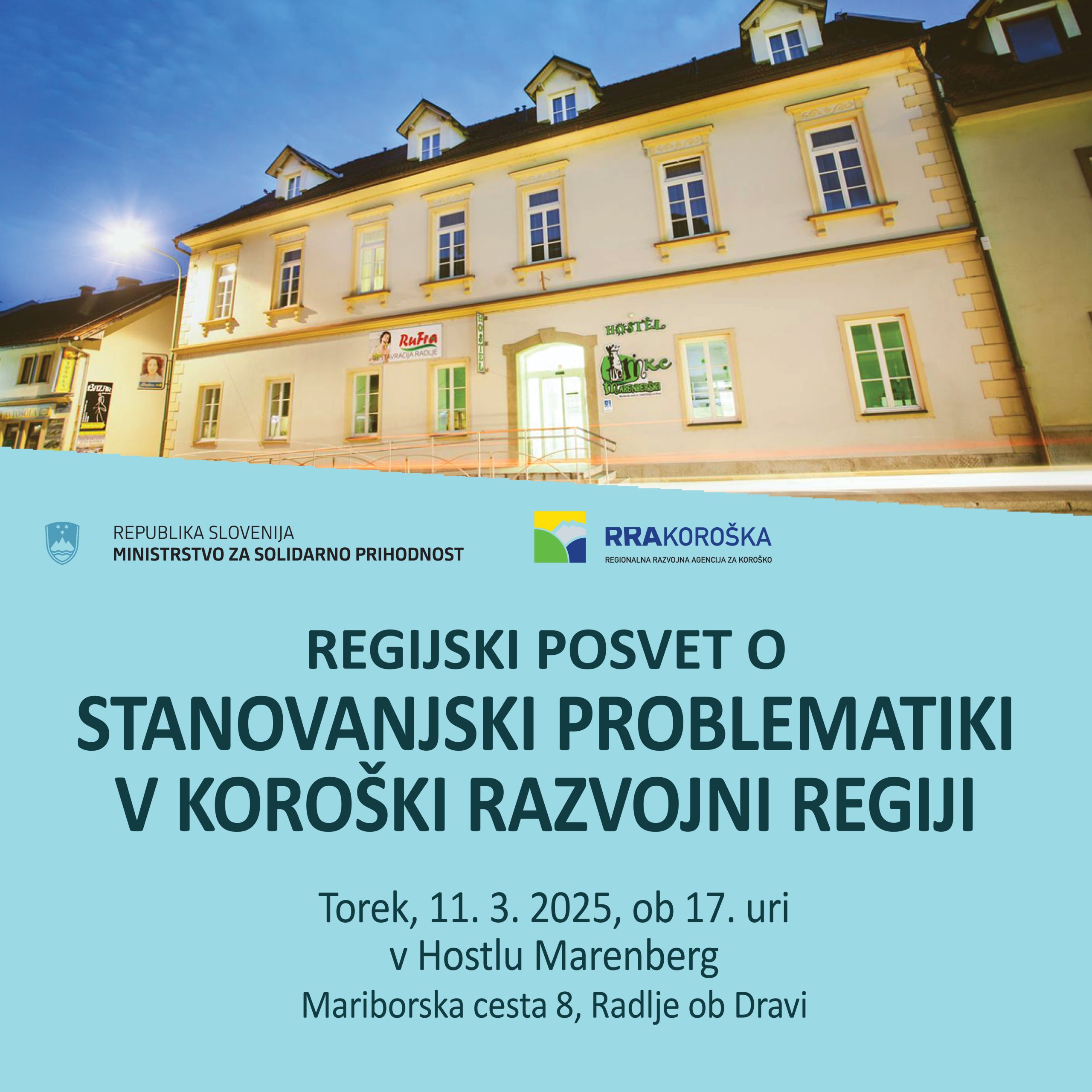 Ministrstvo za solidarno prihodnost in Regionalna razvojna agencija za Koroško RRA Koroška vabita vse prebivalke in prebivalce koroške regije na regijski posvet o stanovanjski problematiki v Koroški regiji, ki bo potekalo v torek, 11. marca 2025, v Hostlu Marenberg v Radljah ob Dravi.