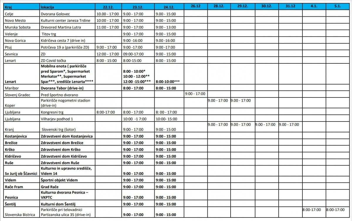 Množično testiranje na okužbo z novim koronavirusom s hitrimi testi danes poteka v več kot 20 krajih po Sloveniji. V večini so s tem začeli v sredo, ponekod pa bodo nadaljevali tudi med ali po praznikih, je razvidno iz seznama ministrstva za zdravje.