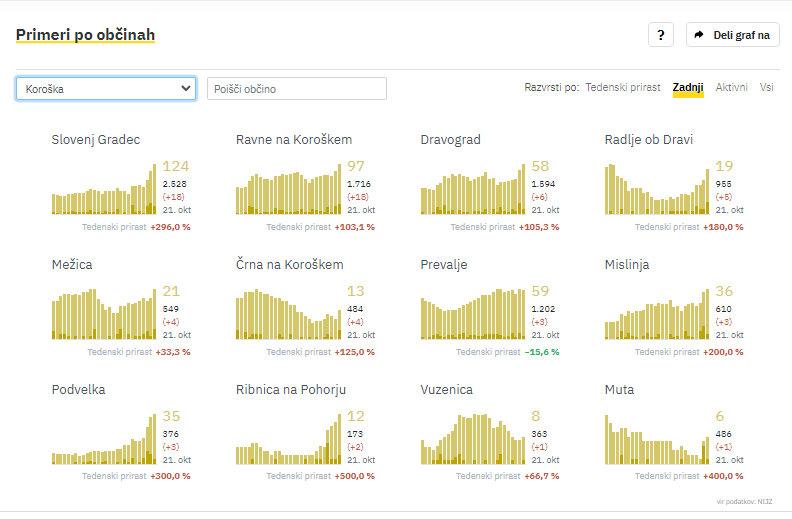 Po oceni NIJZ se je število aktivnih okužb v državi dvignilo za 1.136 in trenutno znaša 16.040. Na Koroškem je po podatkih sledilnika aktivnih okužb 489, dan pred tem 430. V regiji so včeraj največ novih okužb potrdili v Slovenj Gradcu in na Ravnah, kjer so jih zabeležili po 18. V Dravogradu 6, v Radljah ob Dravi 5, v Mežici in Črni na Koroškem po 4, na Prevaljah, v Podvelki in v Mislinji po 3, v Ribnici na Pohorju 2, v Vuzenici in na Muti pa po 1.