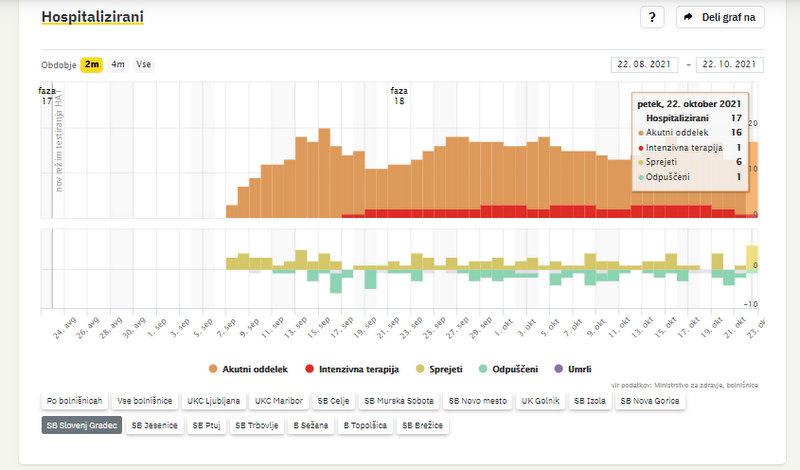 V Splošni bolnišnici Slovenj Gradec zdravijo 17 covdinih bolnikov, 5 več kot dan prej. Intenzivno zdravljenje potrebuje 1, enako kot dan prej. Na novo so v bolnišnico sprejeli 6 oseb, v domačo oskrbo pa odpustili 1.