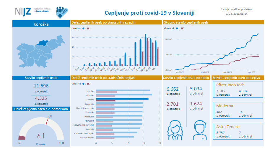 Kot je razvidno iz podatkov NIJZ je na Koroškem prvi odmerek cepiva prejelo 11.696 oseb, oba odmerka pa 4.325. Delež precepljenosti po podatkih NIJZ znaša 6.11.