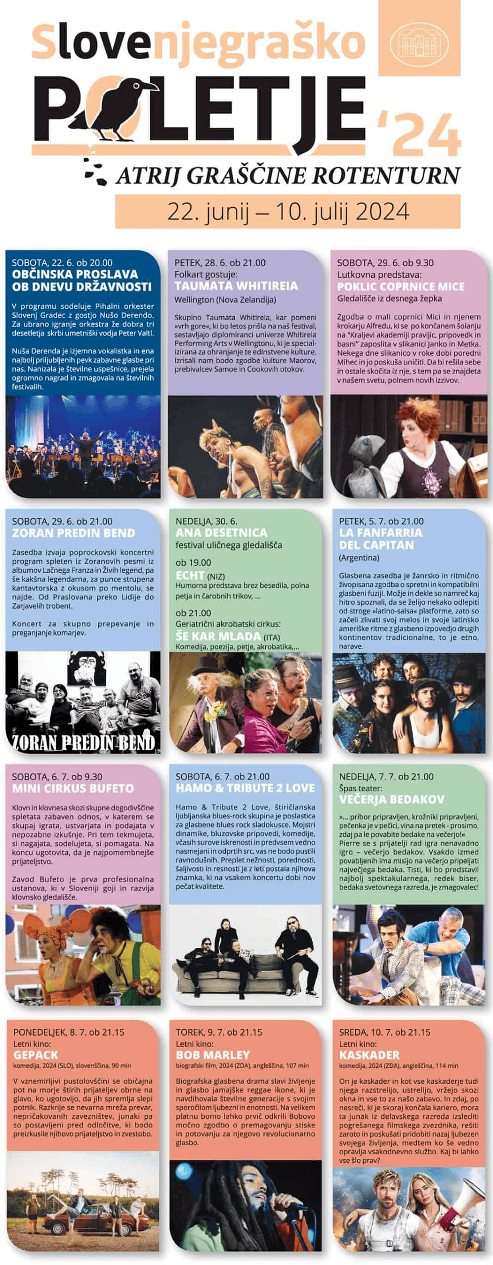 Občina Slovenj Gradec ter Kulturni dom Slovenj Gradec vas vabita, da se pridružite in skupaj ustvarite nepozabne poletne spomine. Vabljeni vsi, od blizu in daleč, da uživate v bogatem kulturnem programu, ki bo zagotovo nekaj posebnega za vsakogar!
