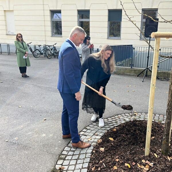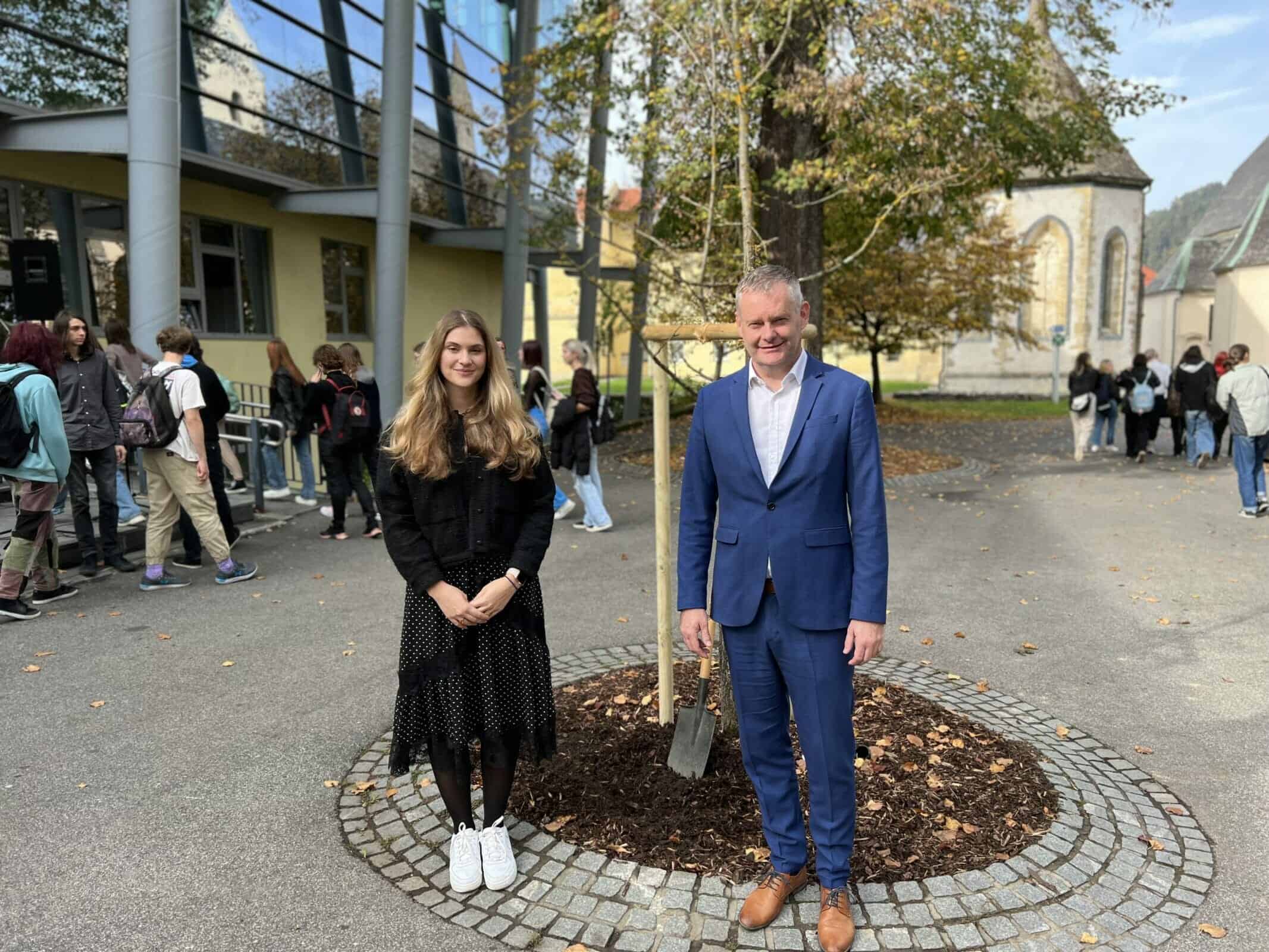Drevo, ki bo krasilo park pred gimnazijo, je izbrala Hortikulturna komisija Mestne občine Slovenj Gradec. Gre za prav posebno drevo, tako imenovani živi fosil. Ta vzdevek si je dvokrpi ginko ali botanično ginko biloba prislužil, saj je predstavnik rodu ginkovcev, ki je svoj glavni razvoj doživel v času dinozavrov. Ledeno dobo je preživela samo vrsta ginko biloba, in sicer na območju jugovzhodne Kitajske. Tam ga častijo kot 'drevo spoznanja', zato je njegova umestitev pred gimnazijo še toliko bolj simbolna, so pojasnili na spletni strani MO Slovenj Gradec.