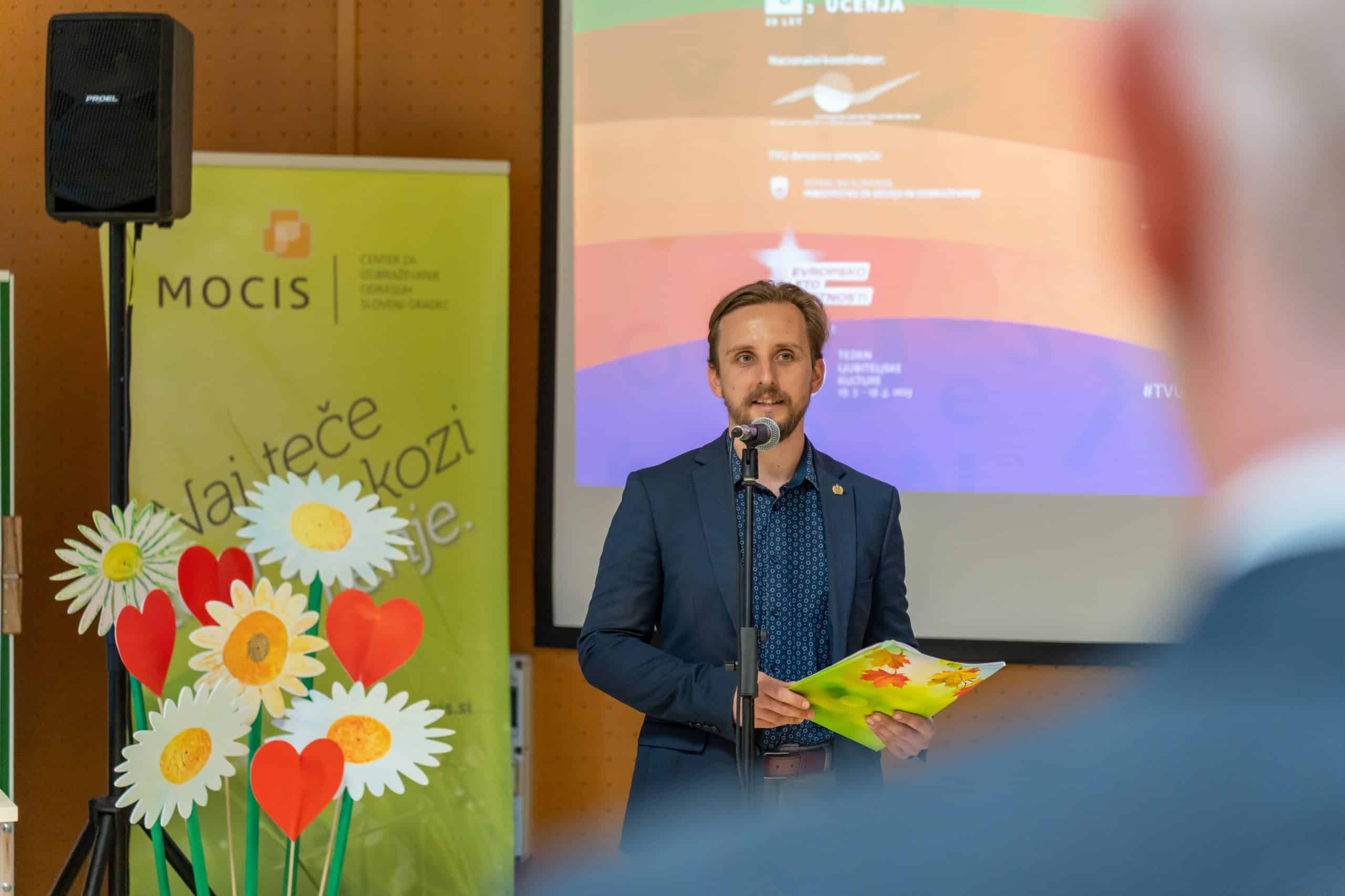 Tilen Klugler, župan Mestne občine Slovenj Gradec je v nagovoru povedal: "Slovenj Gradec se je v zadnjih letih postavil na zemljevid kot pomembno izobraževalno središče. Ponosni smo na našo bolnišnico, na naše vrtce, na mrežo osnovnih šol. Tukaj imamo najmodernejši šolski center v Sloveniji. Imamo veliko organizacij, ki delujejo vsaka na svoji prostovoljni bazi, tu je naš JZ Mocis, ponosni smo na naši obe fakulteti. Tudi dom starostnikov je pomembna kulturna institucija. Delujemo zelo medgeneracijsko odlično. Ponudba, ki jo vidimo danes tukaj v prostorih MKC-ja dokazuje, da imamo ogromno tovrstnih dejavnosti. Vsak svoje znanje prenaša na prostovoljni bazi svojim prijateljem in našim zanamcem. Če bomo delovali tako tudi v prihodnje se za odličnost in razvoj Slovenj Gradca ni bati."